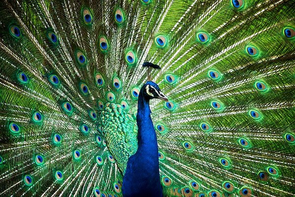 U pávů je výrazný sexuální dimorfismus. Tělo samce je větší, v průměru 90 cm. A když se připočítá dalších 160 cm, tedy objem dlouhých okrasných per, páv se najednou stane až dvoumetrovým. Hlava a krk samce disponují výraznou tmavě modrou barvou, která ovšem přechází i do odstínů azurových, zelených nebo purpurových. Do podobných odstínů je zbarvena i pávova korunka na vrcholku hlavy. Okolo tmavých očí lze spatřit bílé kresby. Břicho páva je pak černé, hřbet zelenohnědý a křídla jsou barev hnědých s černými proužky. Pávův pravý ocas je malý a hnědý. Pera, která tak obdivujeme, nazýváme nadocasní. Páv jich má přibližně kolem 200. Na konci každého nadocasního pera se rozprostírá duhové oko. Tato okrasa samcům narůstá až ve třetím roce života a slouží jako nástroj k dvoření. Páv rozvine pera v obrovský vějíř a natřásá se. (Je však možné, že těmito pohyby vyrovnává svou stabilitu při silném větru.) Svatební tanec samců, odehrávající se ráno či večer, je doplněn velmi hlasitým křikem.
